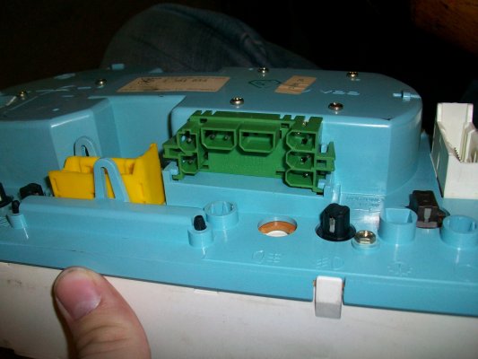 Step 11: Undo the 4 screws on the back of the speedometer. Do not try to take the speedometer out just yet. Take this green connector out first by pushing on the two tabs on both sides and pulling down and out:
