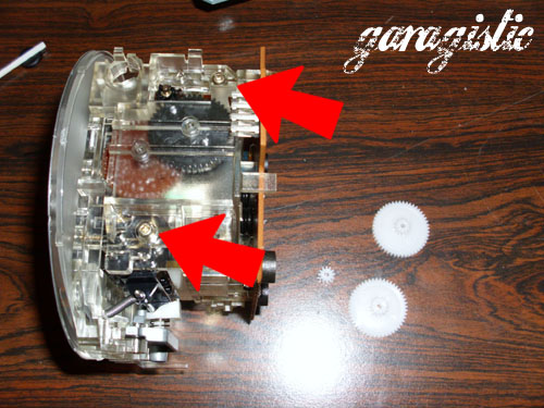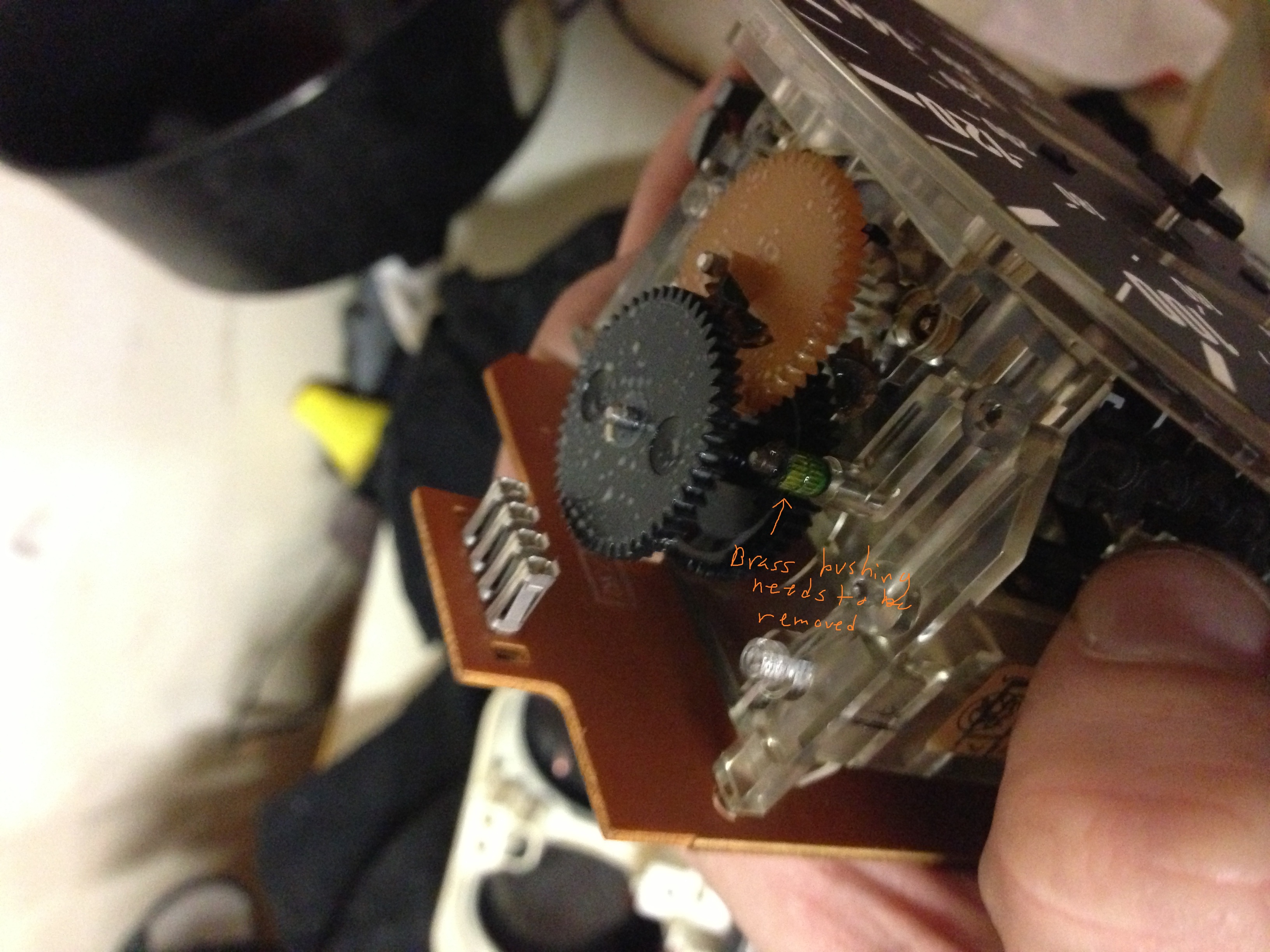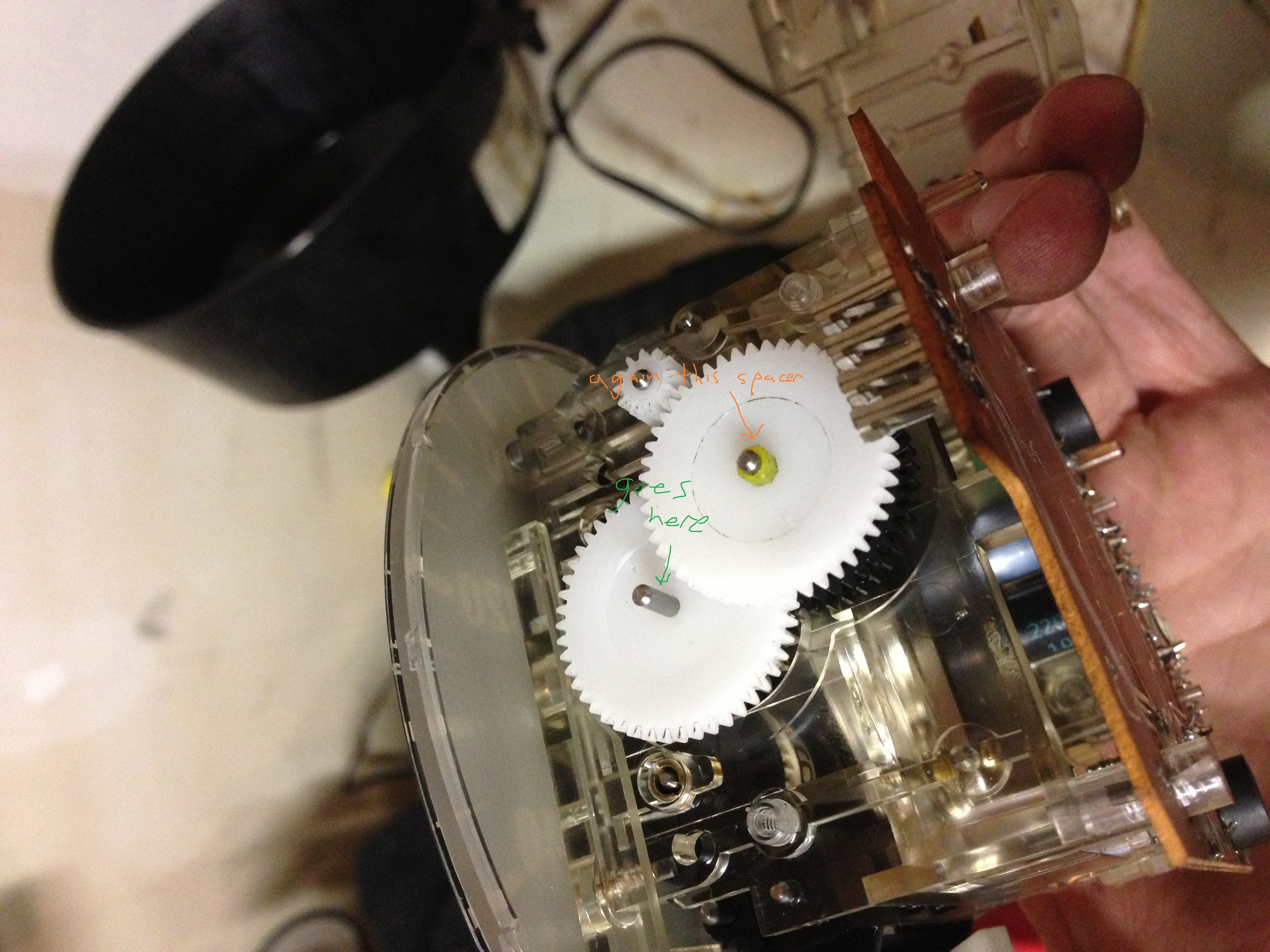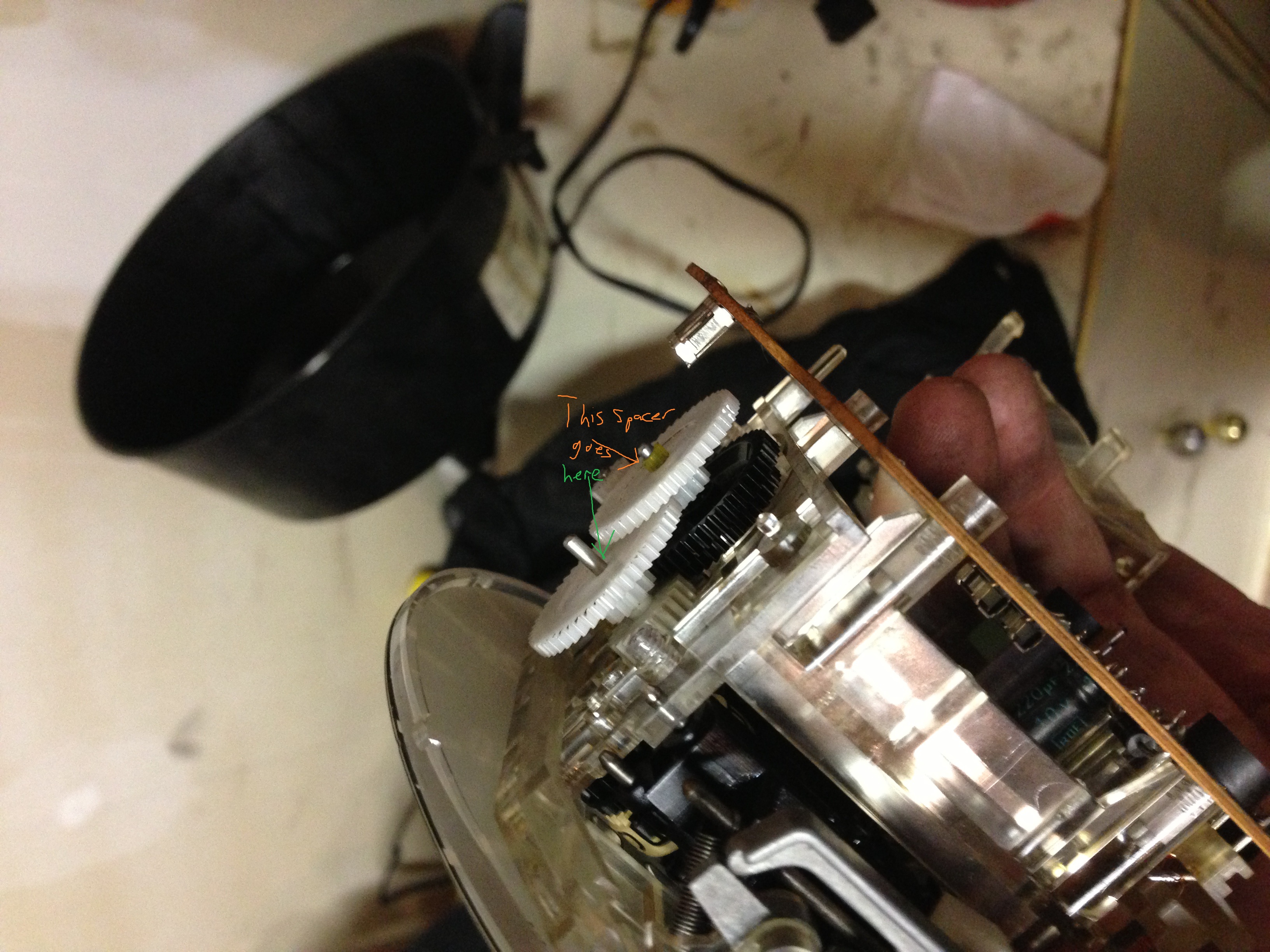 After you reassemble the gears make sure to put the spacer on, and make sure to put it on the right shaft, as you can see I put it on the WRONG shaft (I put the spacer on the correct shaft before reassembly but did not take a picture) and have indicated the correct shaft: