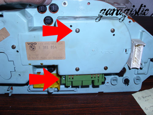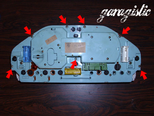 Step 9: Take the cluster out and unscrew these screws (plus two additional screws at the bottom that are not indicated in the picture):