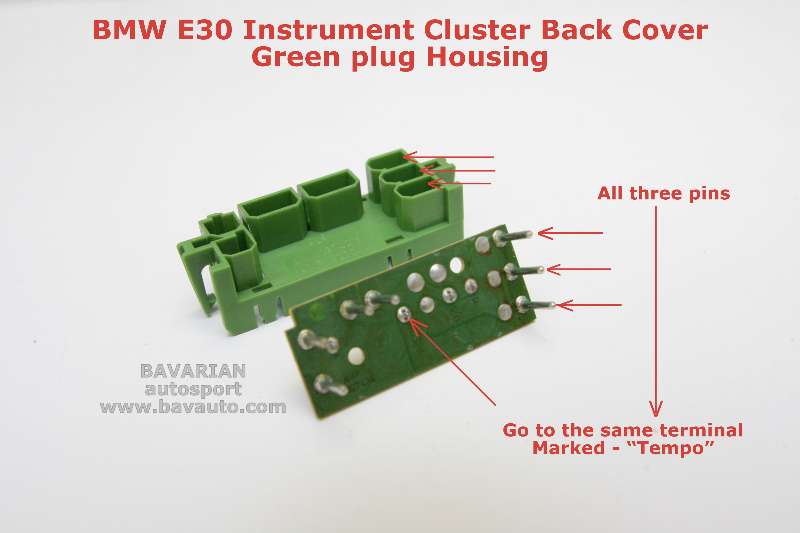 Step 8: On many E30’s there are also two smaller connectors that connect to this green piece at the bottom of the back of the speedometer, on my e30 there were two small connectors, they plug into the left side of the cluster, as the second picture illustrates all three connecting points go to the same point, so in theory it does not matter which of the three slots you use when you reconnect: