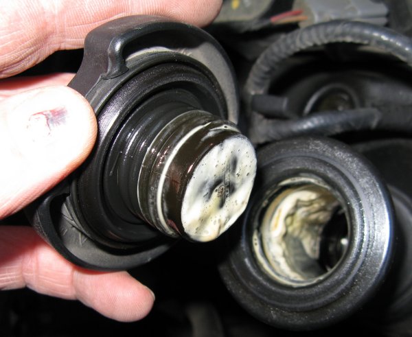 - Check under the oil cap, dip stick and under the coolant cap, do you see anything that looks like a milky substance? This indicates oil and water mixing. Which most often indicates a head gasket failure. If you find this, walk away. This repair is substantial and requires separating the engine in two (head and block).